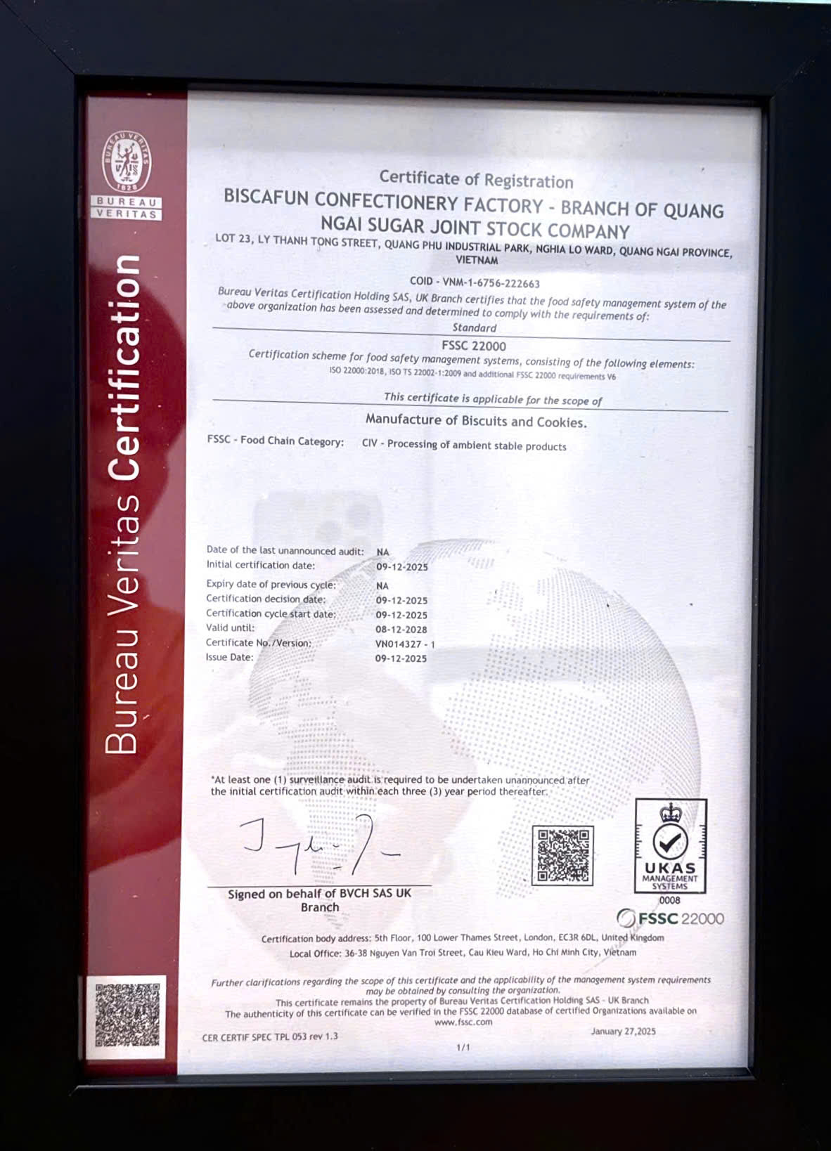 BÁNH QUY BISCAFUN ĐẠT CHỨNG NHẬN FSSC 22000 Thứ hai, 14:12 Ngày 19/01/2026 Dây chuyền bánh quy Biscafun đạt tiêu chuẩn FSSC 22000 do Bureau Veritas Certification cấp. Tin tức & sự kiện khác BISCAFUN - ISO 9001 : 2015 BISCAFUN - TIÊU CHUẨN HALAL BISCAFUN - ISO 22000 : 2018 BISCAFUN - ISO 14001 : 2015 BISCAFUN - TIÊU CHUẨN THỰC HÀNH TỐT 5S
